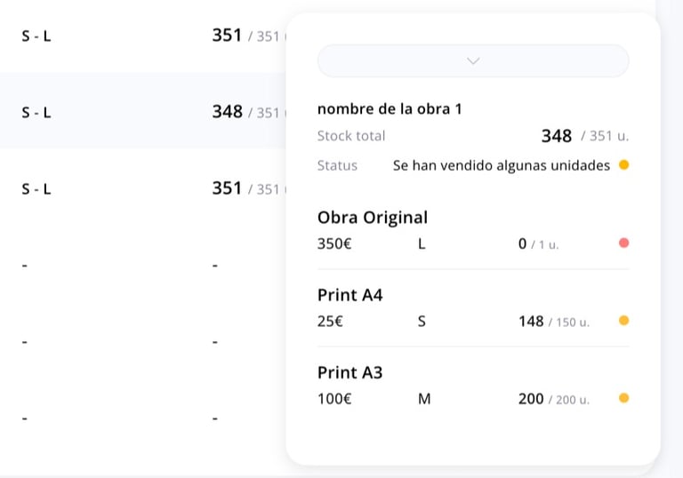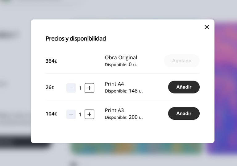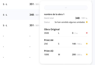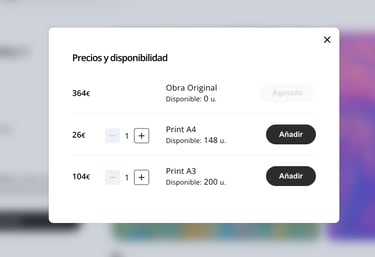 Precio editable, gestión de stock y variantes (original, print, etc.) sin rehacer nada.